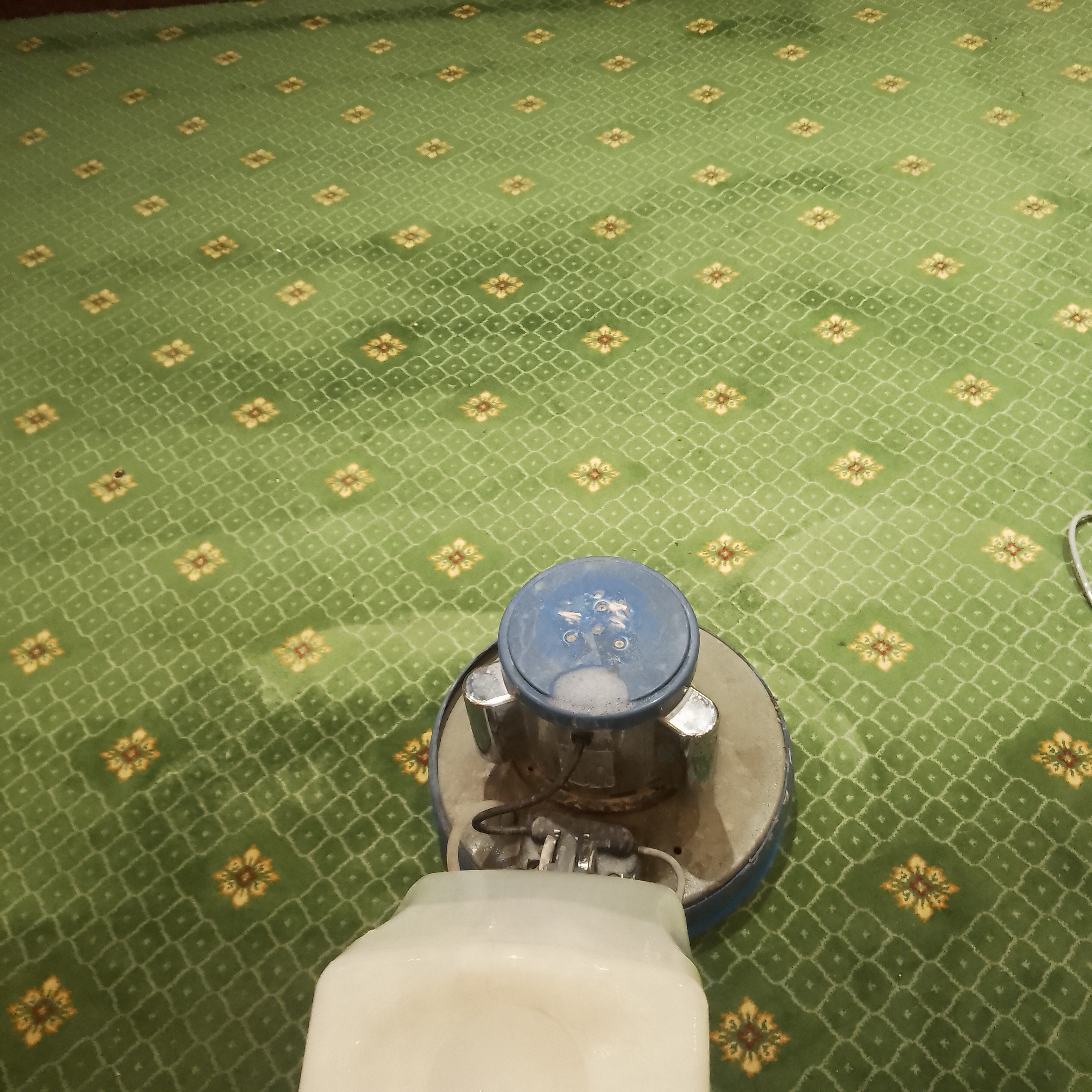 二、干泡清洗(主要用于純毛地毯) 1、用大功率吸塵器全面吸塵, 2、用專用的地毯清潔劑在地毯上邊的油漬、果漬、咖啡漬單獨(dú)進(jìn)行局部特別處理, 3、稀釋高泡地毯清潔劑,將稀釋好的高泡注入水箱,并均勻的噴灑到地毯表面, 4、用手刷處理地毯邊緣、角落和機(jī)器難于推到之處, 5、用裝有打泡器、地毯刷的單盤掃地機(jī)以干泡刷洗的方式清洗地毯, 6、作用一會(huì)兒,然后重復(fù)作業(yè), 7、用地毯梳梳起地毯纖毛加快地毯干燥, 8、采用開窗或使用吹風(fēng)機(jī)等方式使地毯完全干透, 9、用吸塵器吸去污垢和干泡結(jié)晶體結(jié)束清洗 電話:13161252518 |