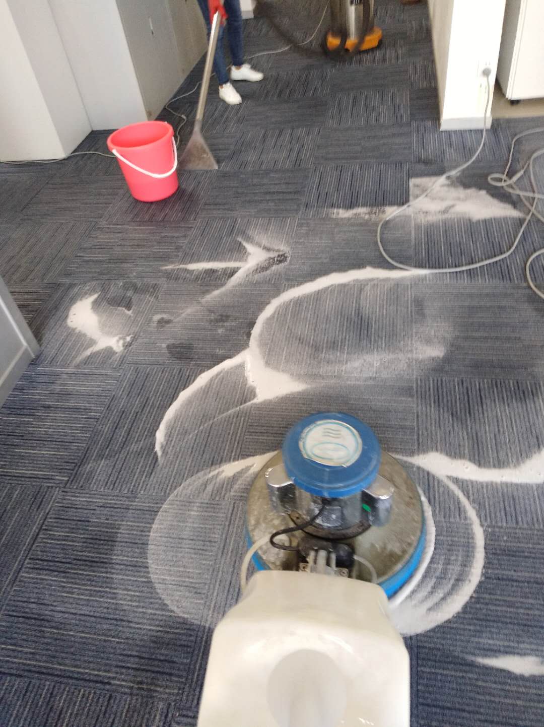 5、用裝有打泡器、地毯刷的單盤掃地機以干泡刷洗的方式清洗地毯,