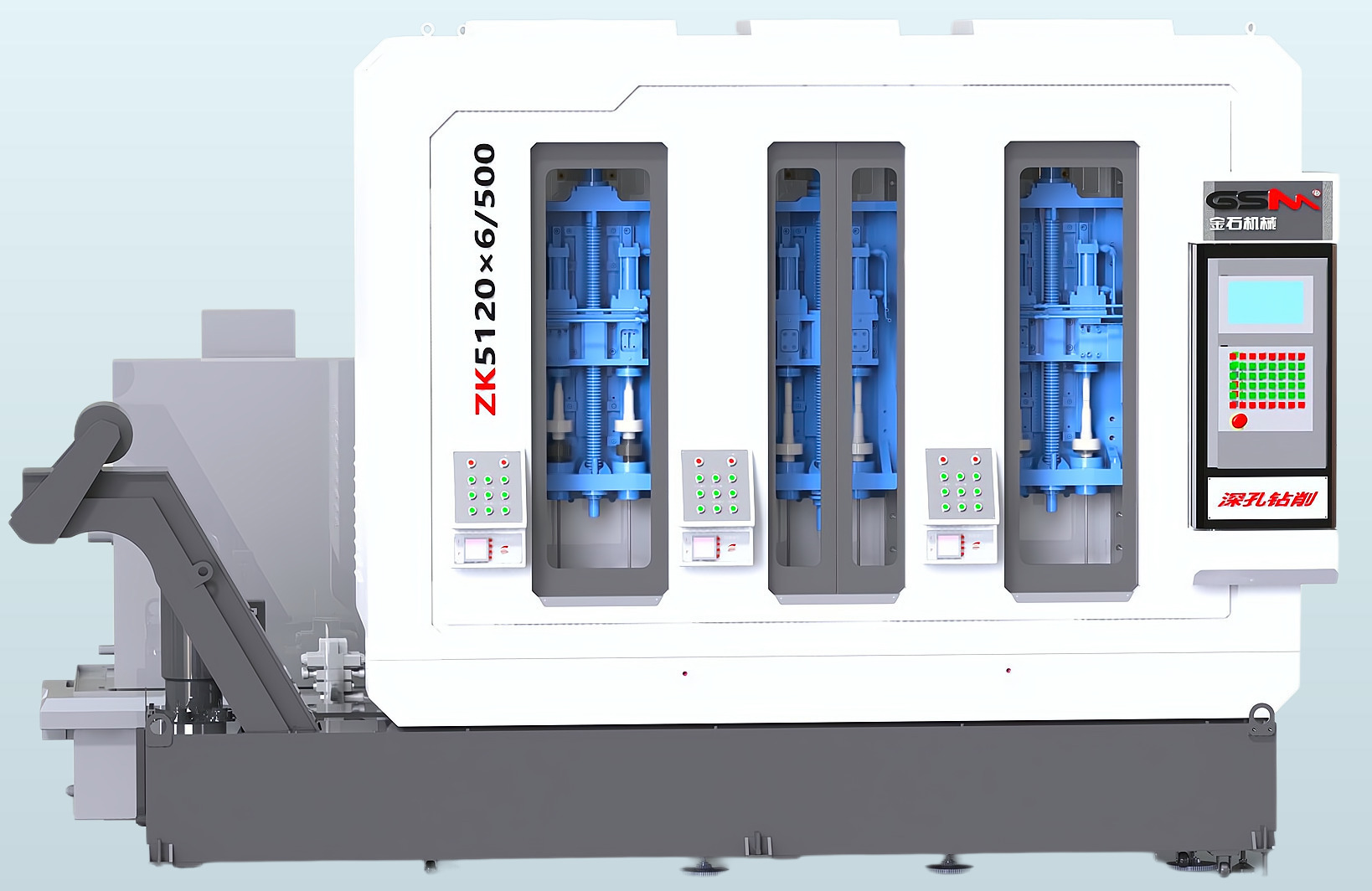 簡要說明:倒立式布局設(shè)計(jì)。槍鉆在下,工件在上,從下向上鉆削加工。排屑順暢,占地面積小。根據(jù)主軸軸數(shù)的不同,機(jī)床分為獨(dú)立的多個(gè)加工單元。各加工單元可單獨(dú)或同時(shí)運(yùn)動(dòng),互不干涉。
