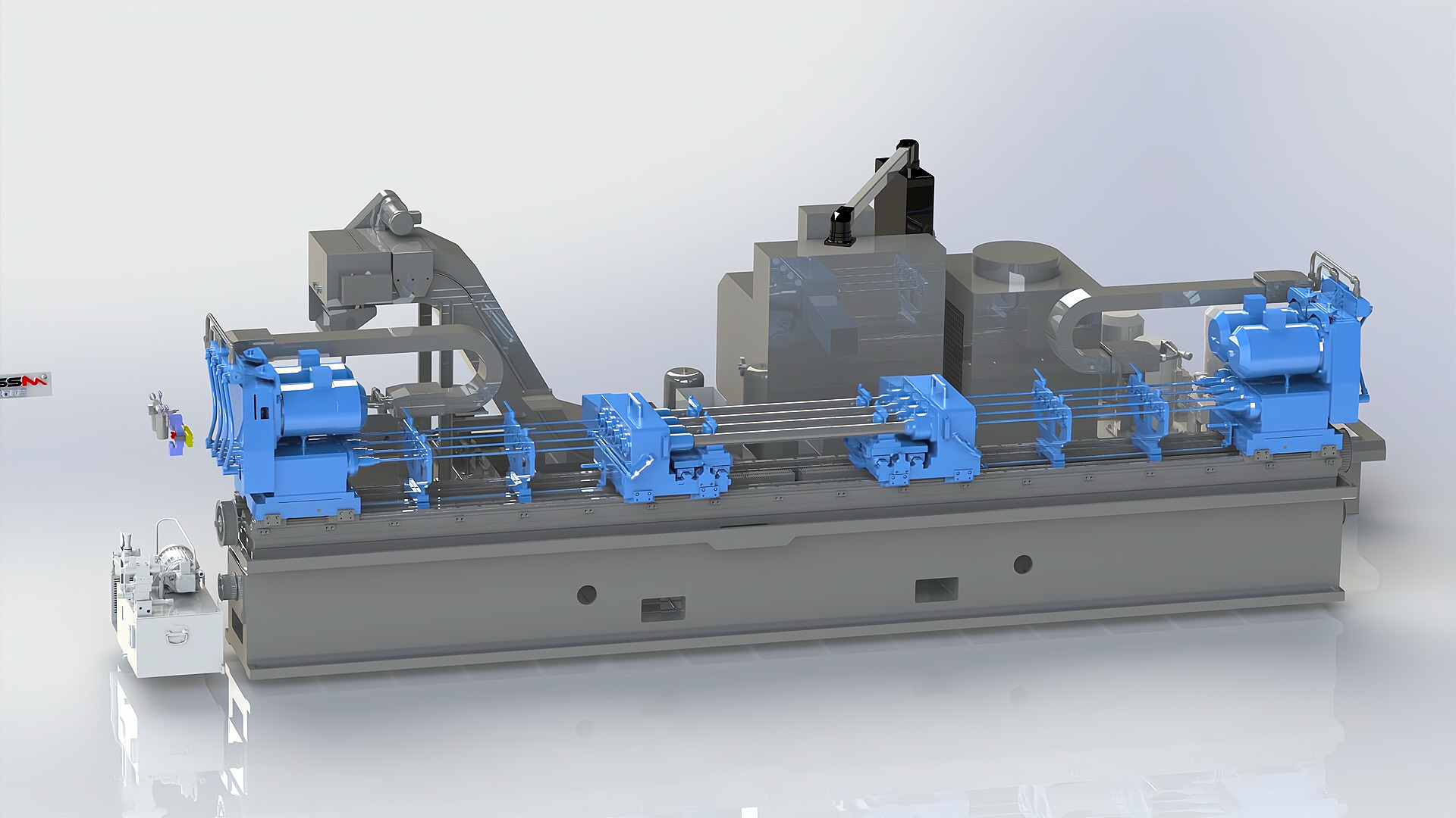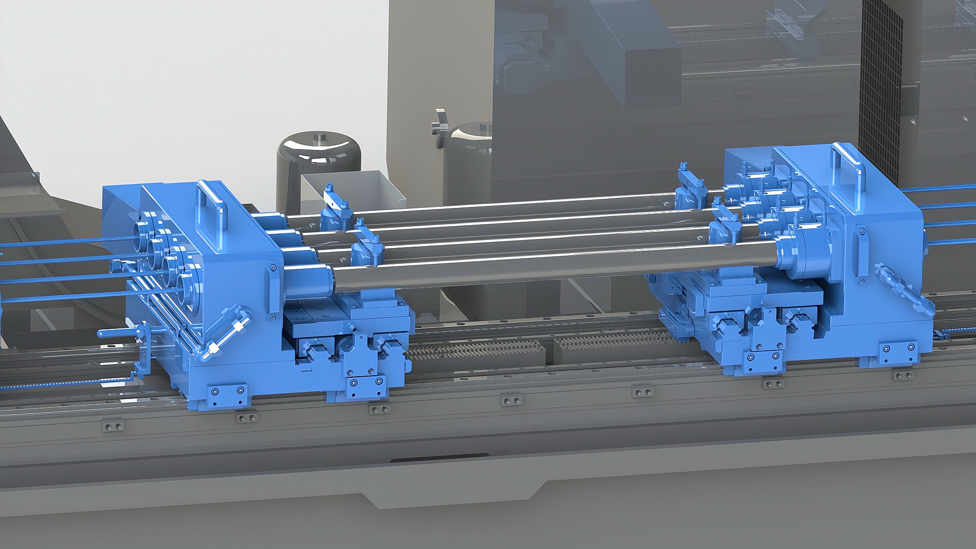裝夾方式: 機床配置數(shù)控橫向移動工作臺;工件采用“V”型鐵支撐工件外圓,液壓旋轉(zhuǎn)壓板自動夾緊工件;一次裝夾,可以完成多個孔位的深孔加工;