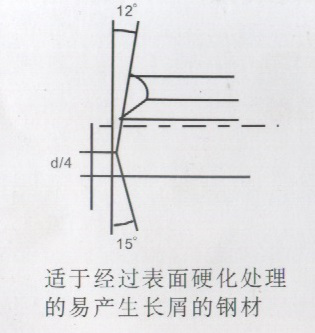 減小槍鉆內(nèi)、外刃角度,即槍鉆內(nèi)外刃磨的更平一些,對加工斷屑有很大的幫助。另外,切削線速度的提高,對斷屑效果也很明顯。加工不易斷屑材料時,槍鉆端刃可以參考如下角度: