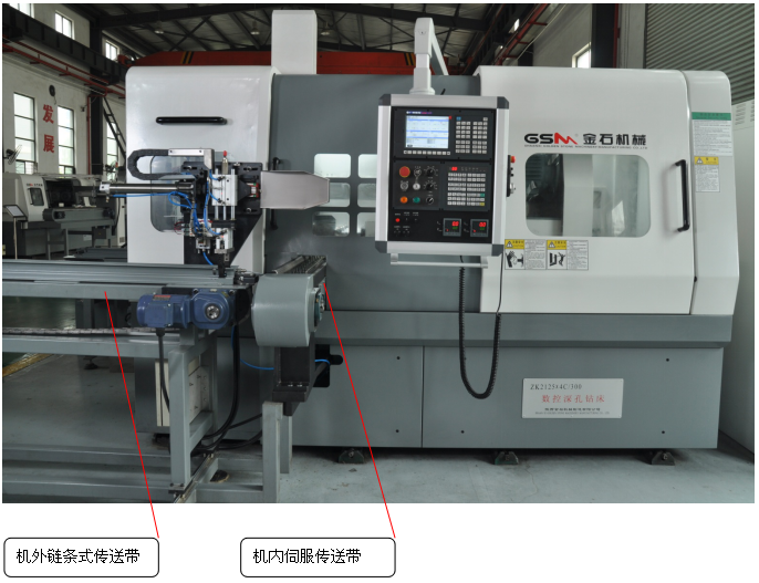 機(jī)內(nèi)伺服輸送帶將工件運(yùn)送至加工區(qū)域的四主軸的正下方;