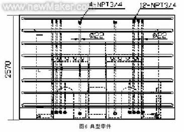 例1:一典型零件(見圖6),有16個Φ22通孔,長度達到2550mm。在沒有使用槍鉆前,類似的深孔加工將會耗費機床25天的時間來完成,而且質量往往得不到保證,現(xiàn)在采用槍鉆后僅用了250小時就高質量的完成了工件上所有深孔的加工,取得了良好的應用效果。