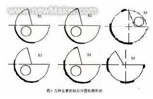 鉆刃是整個槍鉆的關鍵部分,其獨特科學的組合結構保證在完成切削工作同時還起到自導向的作用, 可以通過一次貫穿得到一個高精度的深孔。鉆刃有兩個基本度,可以根據(jù)被切削工件的材料及形式來選擇最恰當?shù)慕M合,以便于工作更好的平衡切削力和斷屑,并將切削力傳遞給支撐凸肩,保證良好的直線度和同軸度。鉆刃有很小的倒錐度并且直徑較刀身略大,可以保證鉆身可以在切削孔內自由旋轉而不會磨擦孔內壁的切削表面,根據(jù)不同要求,刃部有單圓孔、腎型孔和雙圓孔的通道同刀身的油道連接,高壓的冷卻液可以通過此通道到達切削點,并將切屑帶出工件。鉆刃支撐的幾種主要的外圓輪廓形式(見圖3):